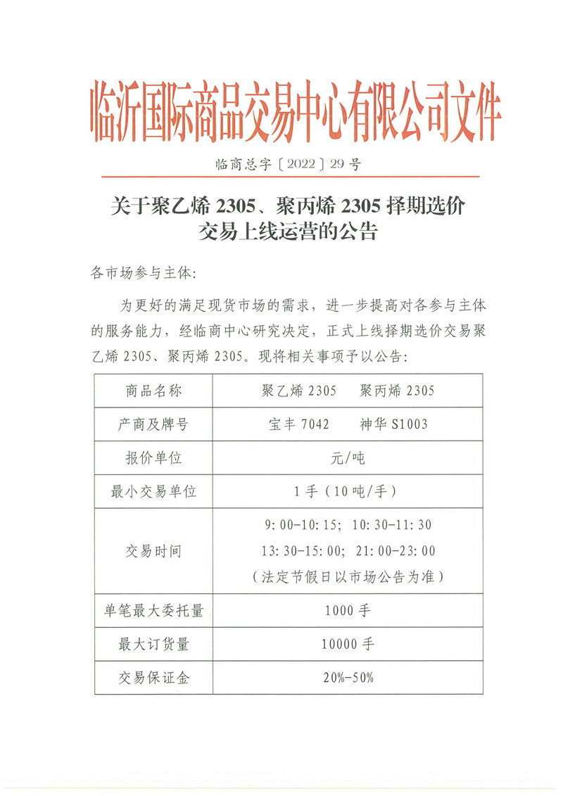 關(guān)于聚乙烯2305、聚丙烯2305擇期選價(jià)交易上線(xiàn)運營(yíng)的公告