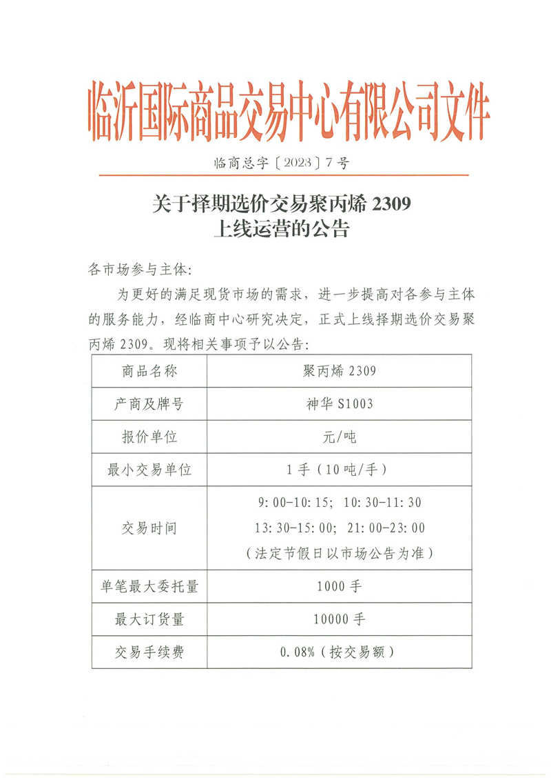關(guān)于擇期選價(jià)交易聚丙烯 2309上線(xiàn)運營(yíng)的公告