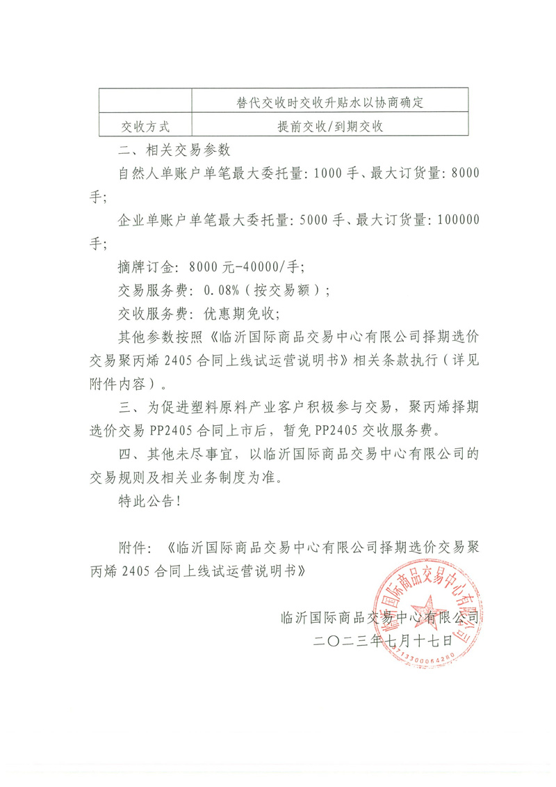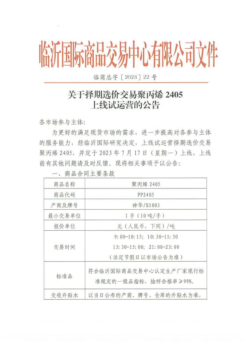 關(guān)于擇期選價(jià)交易聚丙烯2405上線(xiàn)試運營(yíng)的公告
