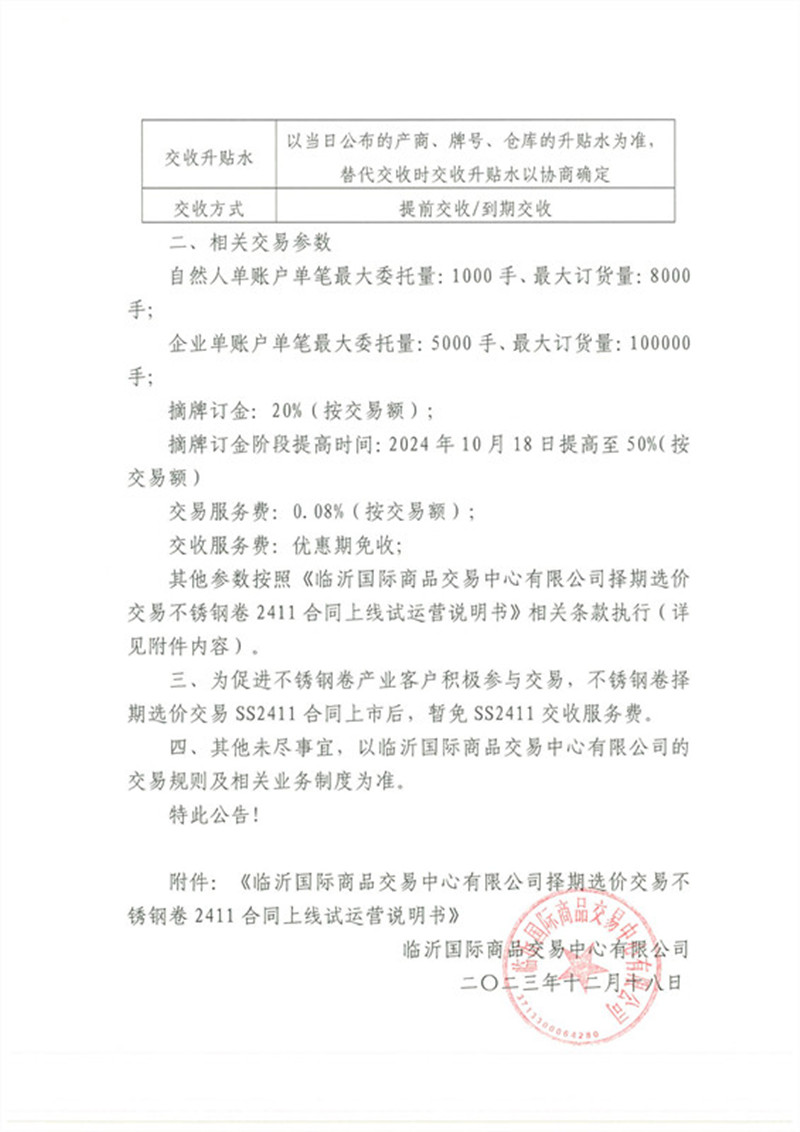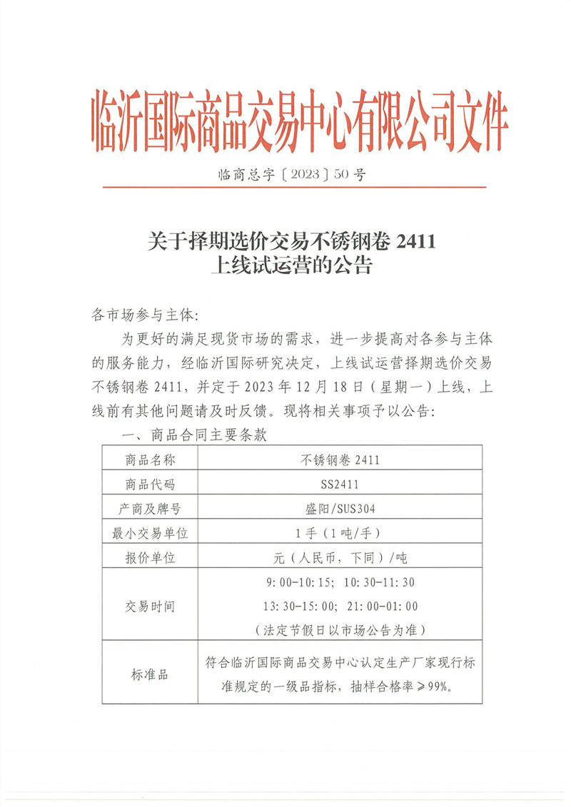 關(guān)于擇期選價(jià)交易不銹鋼卷2411上線(xiàn)試運營(yíng)的公告