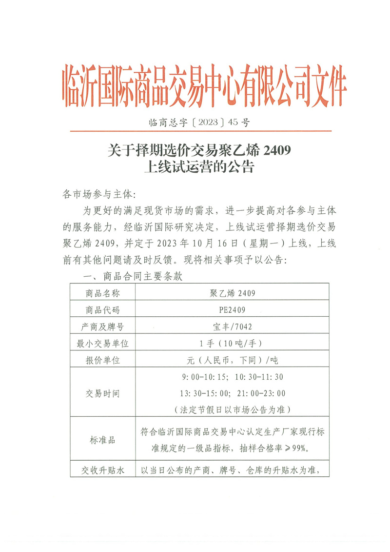 關(guān)于擇期選價(jià)交易聚乙烯 2409上線(xiàn)試運營(yíng)的公告
