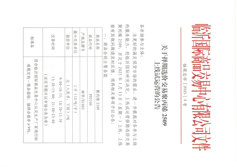 關(guān)于擇期選價(jià)交易聚丙烯2509上線(xiàn)試運營(yíng)的公告
