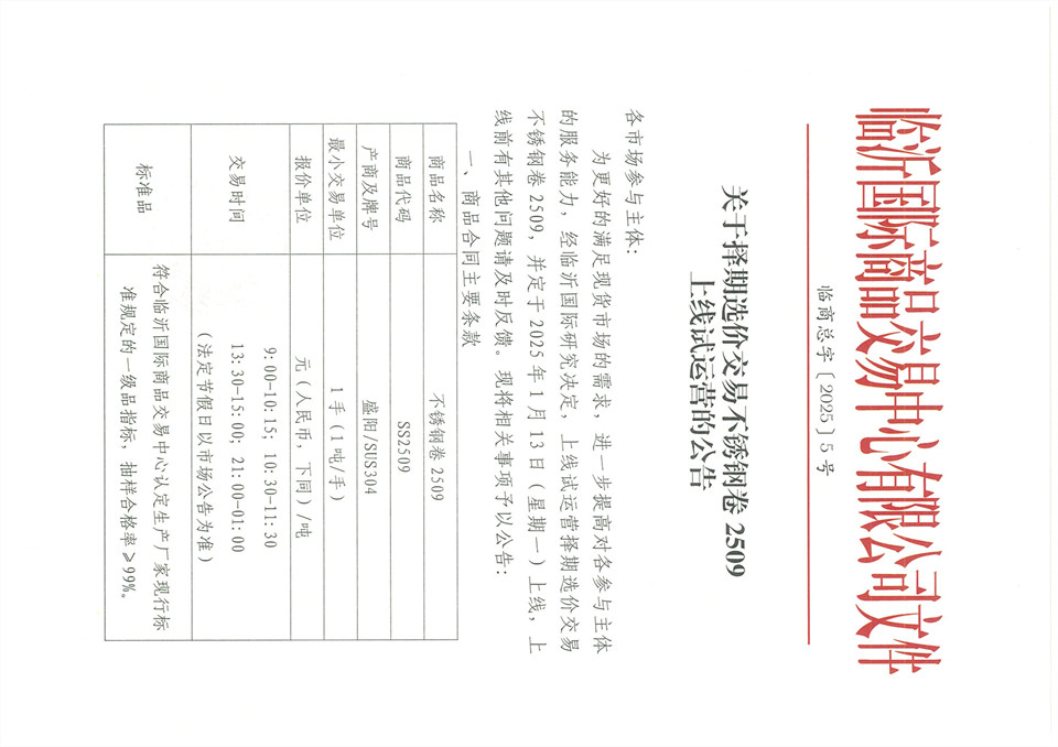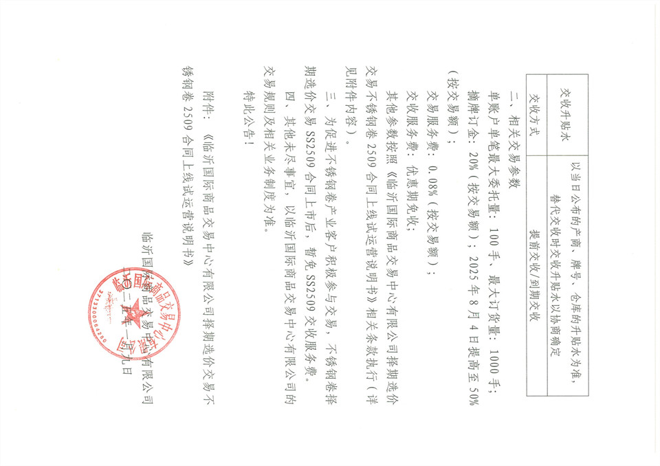 關(guān)于擇期選價(jià)交易不銹鋼卷2509上線(xiàn)試運營(yíng)的公告
